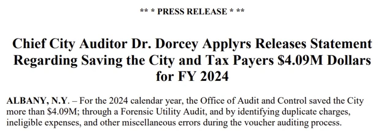 Chief City Auditor Dr. Dorcey Applyrs Releases Statement Regarding Saving the City and Tax Payers $4.09M Dollars for FY 2024” - December 2024 https://www.albanyny.gov/DocumentCenter/View/12090/Saving-Statement-2024